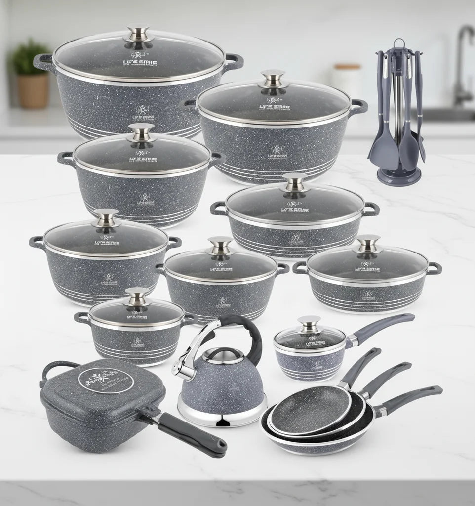 Absolutely! This comprehensive 31-piece set includes a wide array of pots, pans, a double grill, a kettle, and essential silicone tools. It's the ultimate starter kit or upgrade, ensuring you're fully equipped for any recipe. Get ready to cook like a pro!